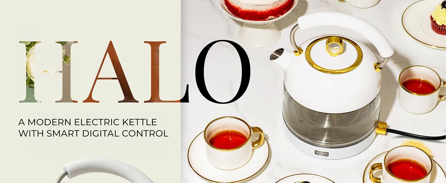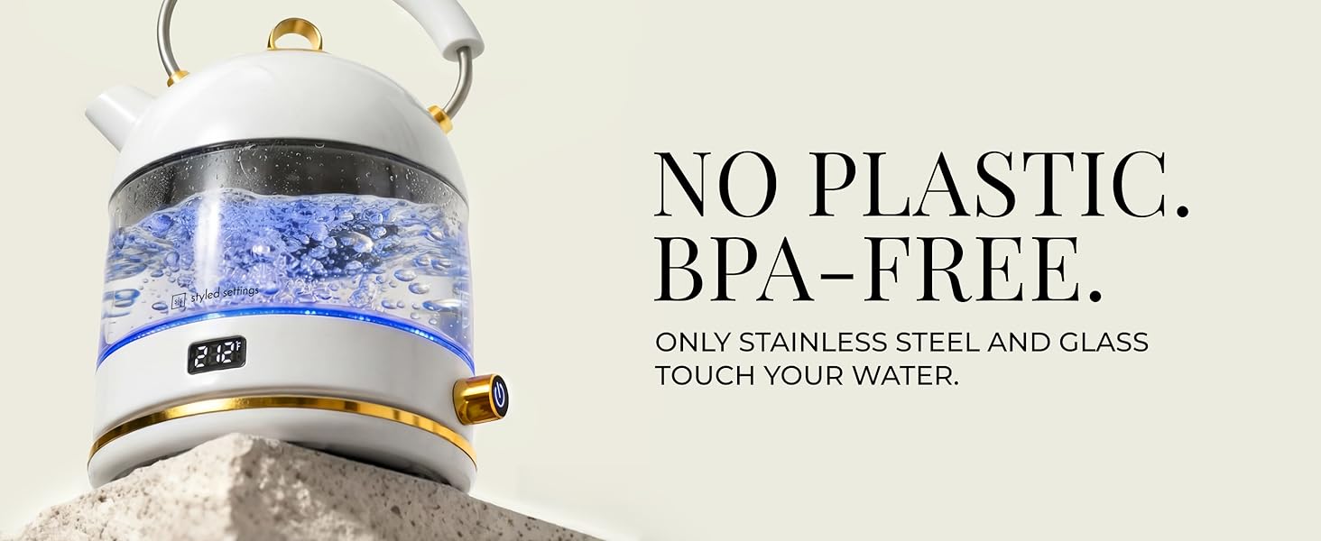 Meet the electric kettle that blends beauty with precision. Crafted from borosilicate glass and accented with brushed gold, it heats water quickly, looks stunning on your counter, and brings effortless control to every brew. With adjustable temperatures, clean materials, and a cordless swivel base, it’s the modern kitchen essential that makes every sip feel intentional — and every moment a little more styled.