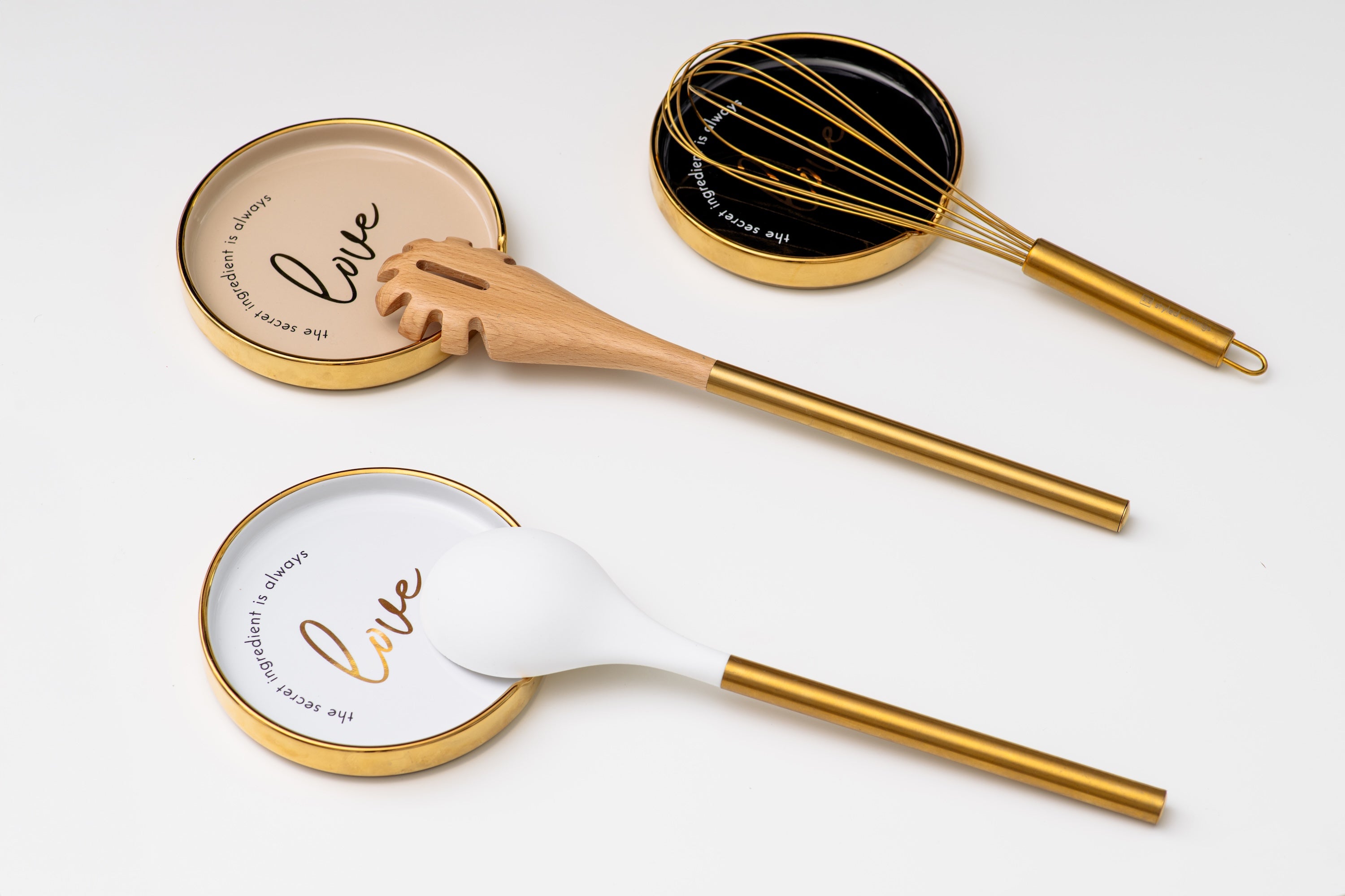 Black and Gold Utensil Holder with Built-in Spoon Rest
